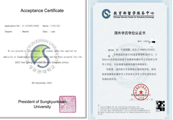 韓國成均館大學錄取通知書及中留服國外學歷學位認證書樣本