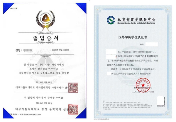 大邱加圖立大學畢業證及中留服國外學歷學位認證書樣本