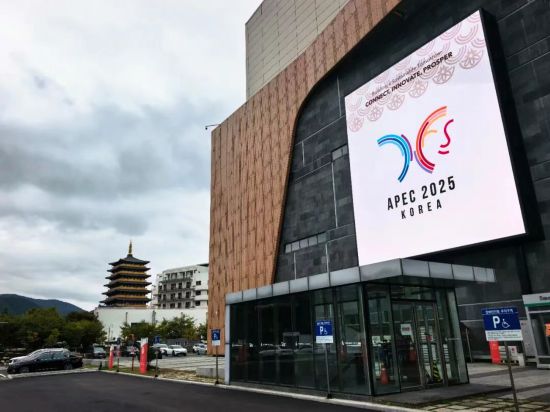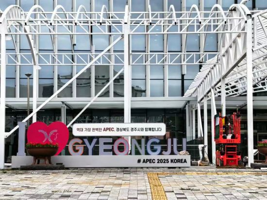 由于尚在施工,慶州和白國際會議中心并沒有向《環球時報》記者展現自己最終的樣貌,目前可以看到的情況是,會場主體建筑規模很大,外立面更多是玻璃結構,會場側面的墻體上有巨大的顯示屏,穿插播放著兩款分別以藍色和白色為底色的APEC會議宣傳海報。會場正門有一塊迎賓標識,上面除了寫著“GYEONGJU APEC 2025 KOREA”,還有一句韓文,大意是“最完美的APEC會議,與慶尚北道慶州市共襄盛舉”。