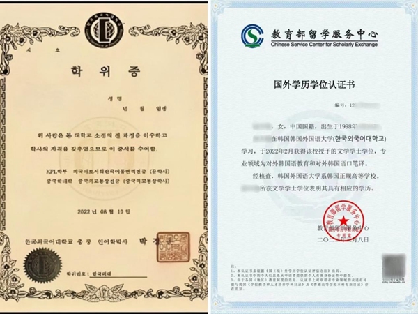 韓國外國語大學學位證書及中留服國外學歷學位認證書樣本