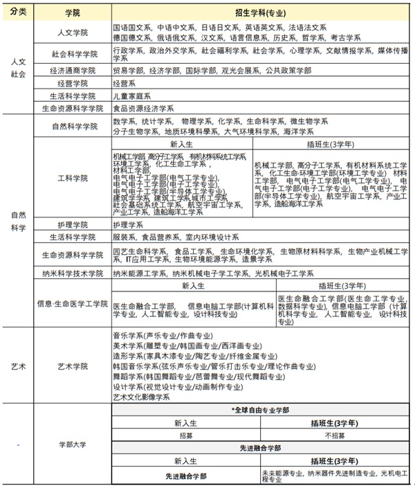 (插班生)2年或3年制的??拼髮W畢業生(預畢業者)或者在4年制大學修完2年(4個學期)以上的課程,同時目前就讀大學取得66學分以上的學生