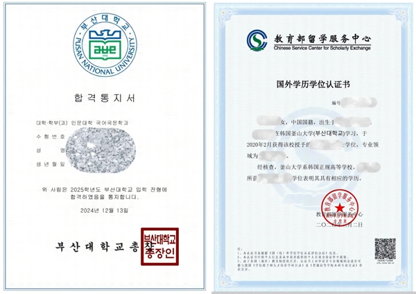 釜山大學錄取通知書及中留服國外學歷學位認證書樣本