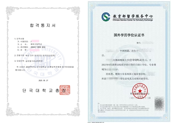 檀國大學錄取通知書及中留服國外學歷學位認證書樣本