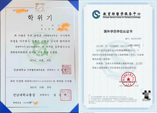 全南大學學位證書及中留服國外學歷學位認證書樣本