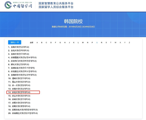 慶北大學中國留學網認證院校查詢頁面