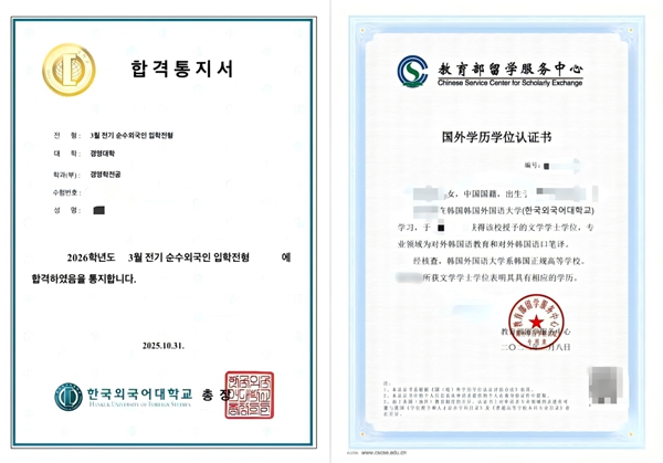 韓國外國語大學錄取通知及中留服國外學歷學位認證書樣本