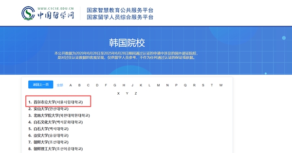 首爾市立大學中國留學網認證院校查詢頁面截圖