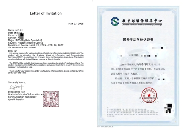 韓國亞洲大學錄取通知書及中留服國外學歷學位認證書樣本