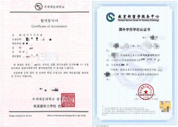 秋溪藝術大學錄取通知及中留服國外學歷學位認證書樣本