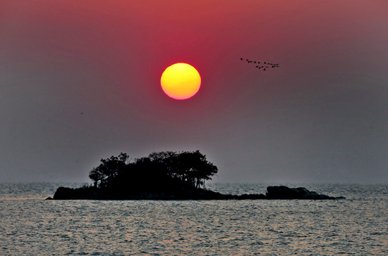 江華島長花里的日落風景唯美,因而素有“夕陽村”之稱。每到日落時分,太陽漸漸下沉到村莊前的石島背后,日落美景非常壯觀。長花里的日落在漲潮與落潮時的景色各有不同,漲潮時,整個海水一片火紅,仿佛就要沸騰,而落潮時,被夕陽映紅的沙灘則顯得凄涼。拍照的絕佳地點非村里的大壩莫屬,沒有任何障礙物,視野又極為廣闊,站在大壩上可以拍到美麗的日落美景。12月31日此處的日落時間為下午5點25分(韓國時間)。