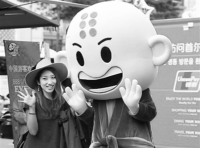 2015年10月6日是韓國首爾的中國游客歡迎日,中國游客在明洞與吉祥物合影。