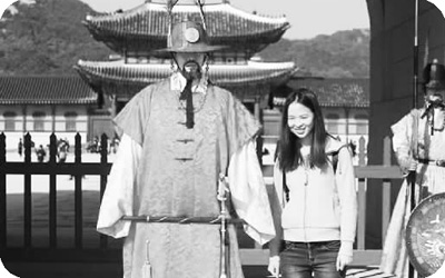 在韓國首爾景福宮外,中國游客與韓國守城門將合影。