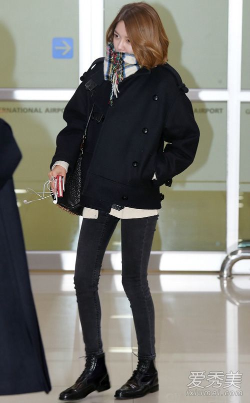 黑色短款大衣配深色小腳褲和靴子,名副其實的筷子腿,輕便又帥氣,圍上格子圍巾比較清新,避免沉悶感。