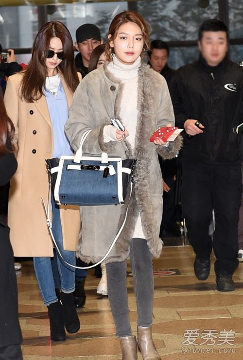 喜歡崔秀英的穿衣風格就是因為比較豐富和多變,不會總是拘泥于一種風格,2016年的最近機場照,身穿淺灰色皮毛一體大衣配白色高領毛衣,下面用灰色緊身牛仔褲配金色靴子,小腿線條優美修長,好看又溫暖,相當實用。
