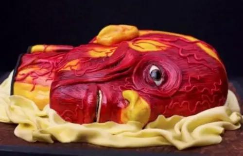 小鳥的頭骨、人類頭顱、被剝皮的鳥的身體、嚙齒動物頭骨等,這些看著令人驚愕的東西,事實上是一塊塊真實的蛋糕。蛋糕師AnnabeldeVetten在制作一個蛋糕時,就做好了令人吃驚的準備。她表示,這些重口味的蛋糕是為那些愛吃甜食,但是卻擁有強大的胃的人準備的。