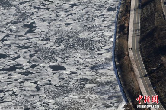 漢江上漂浮的巨大冰塊。韓國全境連日出現嚴寒天氣,南部地區近日出現強降雪天氣,導致濟州機場暫停全部航班起降,蔚陵島客輪停航一周。