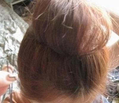 步驟八:繞成一個丸子頭的樣子,丸子頭要夠飽滿才好看哦。然后用小黑夾子將你覺得松的地方夾起來。