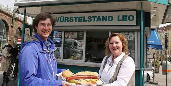 維也納的超人氣街邊小吃攤,稱為Würstelstand,即人行道上的一個個小屋子。這里出售各色腸類快餐食品和汽水飲料,其中最受歡迎的就是加入了10-20%芝士和豬肉餡的烤腸。購買時小哥都會問"Sü oder scharf?",就是問顧客要甜醬還是辣醬。
