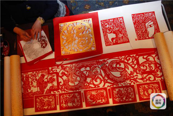 圖為26日,在韓國首爾市樂天酒店內,來自鄂州的民間藝人在展示鄂州雕花剪紙。