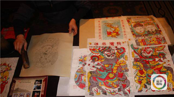圖為26日,在韓國首爾市樂天酒店內,湖北民間藝人展示老河口木版年畫雕刻技藝。