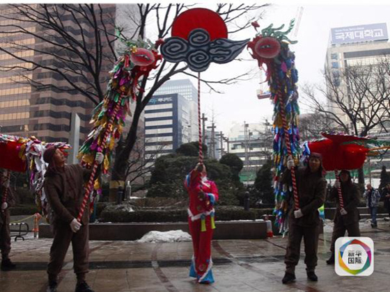 26日白天,韓國首爾氣溫低至零下9攝氏度,空中還飄起了雪花。在市中心的明洞樂天普希金廣場上,上演了一段充滿濃郁荊楚風情的民俗舞蹈。這段《雙鳳朝陽》舞蹈為路過的韓國民眾帶來了一絲慶祝新春的暖意。