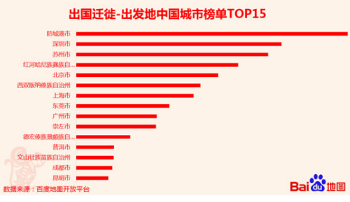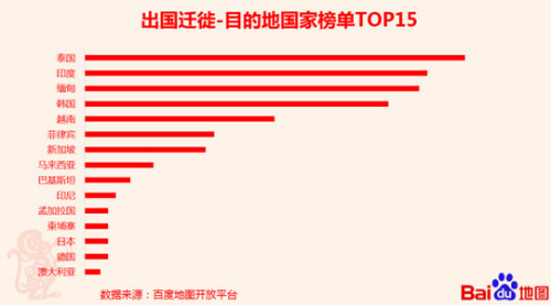 2016年春節剛結束,百度地圖就發布了猴年春節跨國遷徙大數據報告,“數說”國人在春節期間的跨境遷徙動態。報告顯示,春節期間國人的出國目的地中,亞洲國家占了90%,其中泰國、印度、緬甸位居最熱門國家前三甲。而在歐洲國家目的地中,德國和意大利是國人出國過春節的最熱選擇。一線城市的人們對于出行國家各有所好,其中北京人最愛去韓國,上海和廣州市民最愛去澳洲,深圳人最熱衷去伊朗。此外,該數據報告還顯示,受邊境貿易影響,出國出發地城市和回國遷入城市整體呈現邊境城市占比居高的特點。