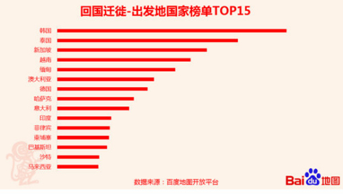 當越來越多的中國游客出境過春節形成“逆向遷徙”的時候,不少旅居海外的游子也千里迢迢自國外歸國與家人團聚。有趣的是,回國遷徙出發地與出國目的地高度重合,根據百度地圖大數據顯示,韓國、泰國、新加坡、緬甸、越南在回國遷徙最熱門出發地中占據前五。拋開越南、緬甸因邊境接壤等因素,出發地國家排名前五的則為韓國、泰國、新加坡、德國、澳洲。