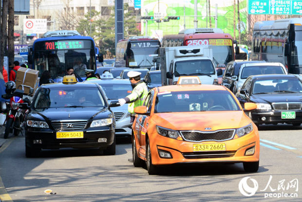 首爾出租車分為一般出租車(橙色或白色)和模范出租車(黑色)。模范出租車費用比一般出租車要貴一倍,乘客乘車時需注意區分。 成碩 攝