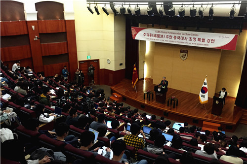 2016年3月16日,中國駐韓國大使邱國洪在韓國高麗大學進行演講。 陳尚文攝