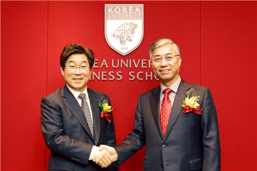 中國駐韓國大使邱國洪(右)與韓國高麗大學商學院院長金東元。