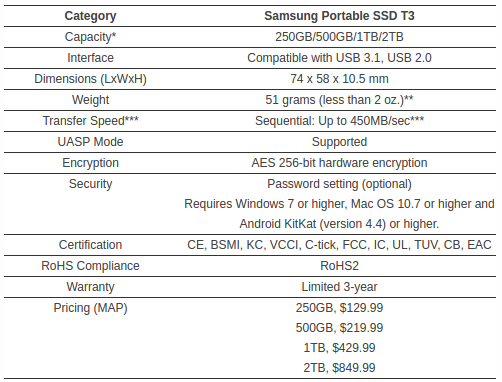 三星T3 SSD移動硬盤的大小為74 x 58 x 10.5 mm,重51克。它支持UASP模式和256-bit AES加密(可選設置密碼),順序傳輸速度高達450MB/s,并且通過了各種認證,質保時間為3年。