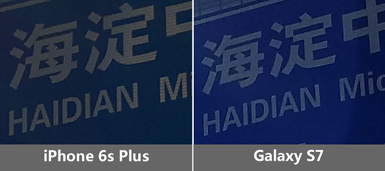 文字部分100%截圖顯示,iPhone 6s Plus拍攝的樣張畫面純凈度較差,文字邊緣出現絮狀模糊。Galaxy S7逆光下分辨率表現優勢比較明顯,文字邊緣更加銳利。