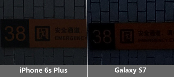 測試結果:兩臺手機在都使用自動曝光值時,亮部表現都還不錯,亮部細節也得到很好保留。暗部細節表現iPhone 6s Plus更好,100%截圖上文字部分更加清晰。
