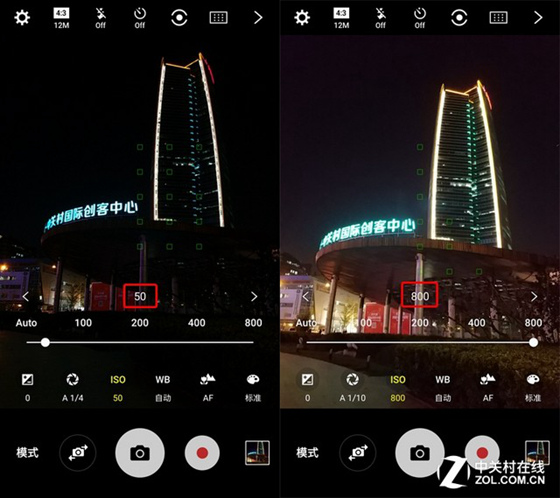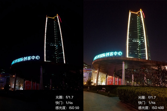 仔細觀察上圖,專業模式下其他參數自動,手動調節感光度數值分別為ISO 50和ISO 800,不難看出照片整體的曝光值有了不小的提升,暗部細節隨著感光度升高而增加,但相應的畫面中噪點也變得更多,純凈度下降。所以權衡畫面曝光值和純凈度,筆者最終選擇使用ISO 400進行拍攝。