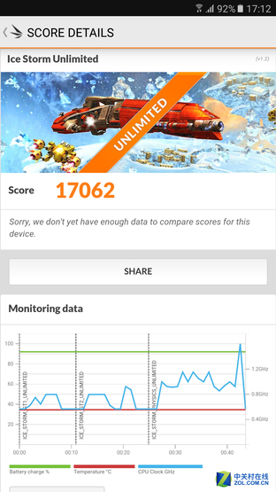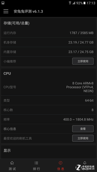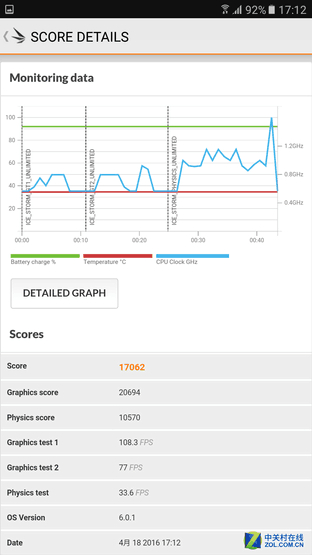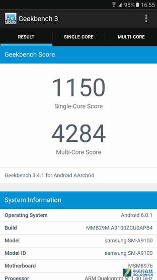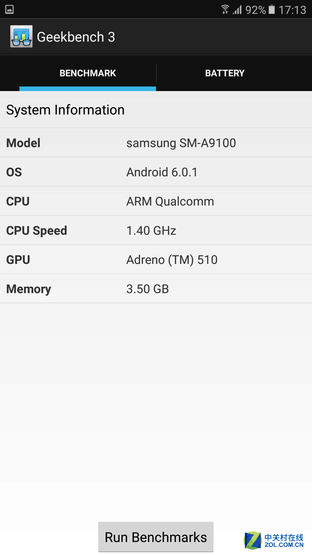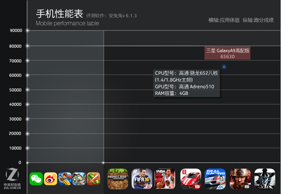因為RAM和電池也都有所提升,所以接下來,我們也對跑分做個簡單的測試。這里說明一下,三星Galaxy A9高配版和之前的版本一樣,是能夠支持快速充電的。但鑒于評測機只有單獨一臺手機,沒有官方標配的充電器,所以這里就無法對快速充電的速度進行測試了。