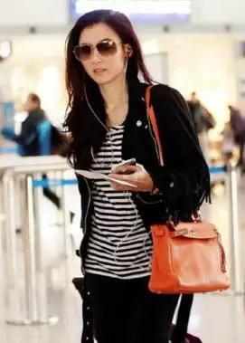 辣媽張柏芝條紋衫搭配皮外套,十分干練。