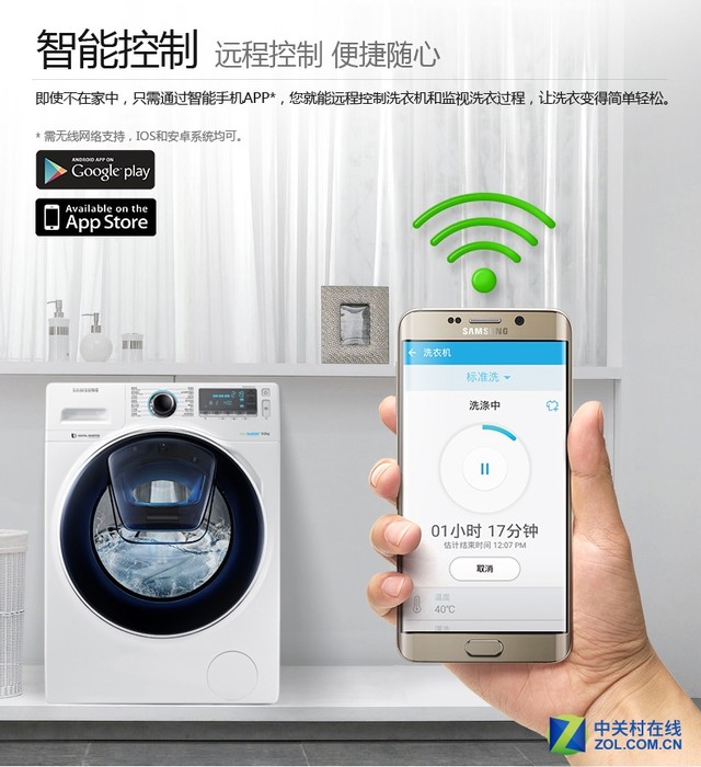 僅需一部智能手機,輕松實現與洗衣機的互聯,手機端可以遠程控制,運籌帷幄;實時監視洗滌過程,一目了然,帶來別樣的洗衣機操控體驗,簡單方便!智能的設計,即使家中的老人不會使用洗衣機也沒關系,一部手機,洗滌無憂,讓家人也享受到智能科技帶來的便捷!