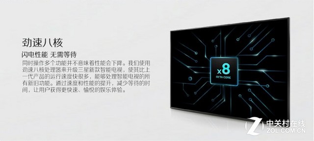 三星UA55JS9800使用勁速八核處理器來升級三星新款智能電視,使其比上一代產品的運行速度快很多,能夠處理智能電視的所有新舊功能。通過速度和性能的提升,減少等待的時間,讓用戶獲得更快速、愉悅的娛樂體驗。