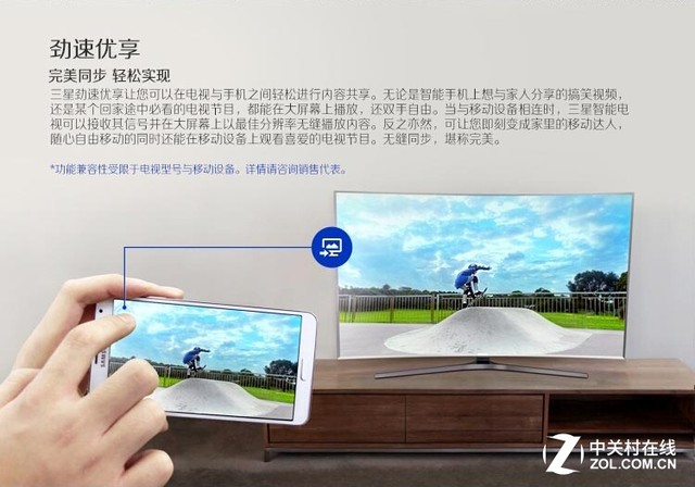 三星UA55JS9800的勁速優享可以在電視與手機之間輕松進行內容共享。無論是智能手機上想與家人分享的搞笑視頻,還是某個回家途中必看的電視節目,都能在大屏幕上播放,還雙手自由。當與移動設備相連時,三星智能電視可以接收其信號并在大屏幕上以更佳的分辨率無縫播放內容。反之亦然,可即刻變成家里的移動達人,隨心自由移動的同時還能在移動設備上觀看喜愛的電視節目。無縫同步,堪稱出色。