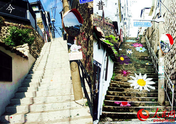最后要給大家介紹的是韓國最著名的壁畫村——梨花壁畫村。梨花壁畫村以前只是一個貧窮的半山村落。70多名藝術家于2006年來到這里,在村子的大街小巷創作了各式各樣美麗的壁畫和雕塑,為這個小村落增添了許多藝術和浪漫氣息。古舊的臺階上開出華麗的花朵,灰色的墻面上布滿花花綠綠的圖案。而在今年4月中旬,當地居民因不堪忍受長期被游客打擾,抹去了包括錦鯉階梯、花朵階梯等具有代表性的壁畫以示抗議。