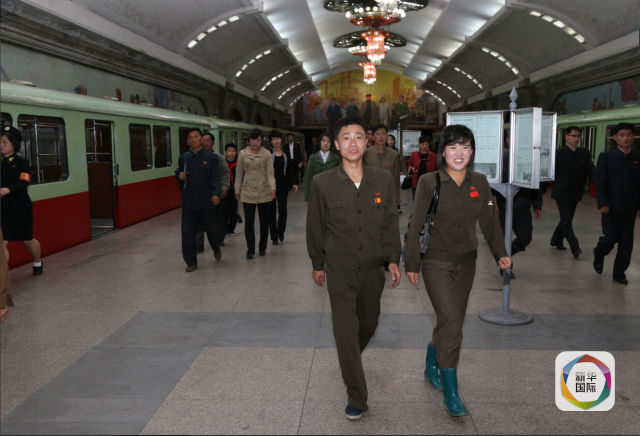 5月7日,在朝鮮平壤,乘客在地鐵內乘車。當日是朝鮮勞動黨第七次全國代表大會召開的第二天。朝方安排外國媒體采訪平壤地鐵。 (新華社記者郭一娜攝)