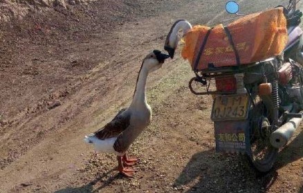 照片顯示,一只母鵝被綁在機車上,一只公鵝站在車下,它們嘴對嘴。不少網友看完這兩只愛情鵝“淚奔了”,也有人腦洞大開,延伸出各種后續故事。不過,當地媒體采訪主人,得知這兩只鵝是青梅竹馬,但都已經被吃了。