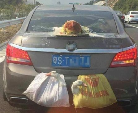 網友微博上爆料,高速路上遇到一輛極具喜感的畫面:一輛轎車的車尾吊著兩只鴨,后蓋上還趴著一只雞…… 網友稱:后置發動雞和雙渦輪增鴨,這車配置好高我被嚇到了!