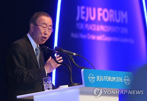 5月26日,正在韓國訪問的聯合國秘書長潘基文出席在濟州會展中心舉行的“濟州論壇”并發表主旨演講。(圖片來源:韓聯社)