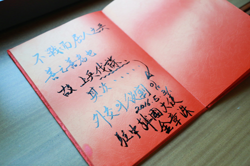 作為韓國駐華大使,金章洙對中國進行過很多的研究。在軍校學習時,他就曾讀過中國古代軍事家孫武的名著《孫子兵法》,不但對其中的“不戰而屈人之兵,善之者善也”、“上兵伐謀、其次伐交、其次伐兵”等名言熟記于胸,還能用毛筆將其寫成漂亮的漢字。他認為,“上兵伐謀”的理論同樣適合應用到外交中,“就是首先必須要對對方了如指掌?!?/p>
