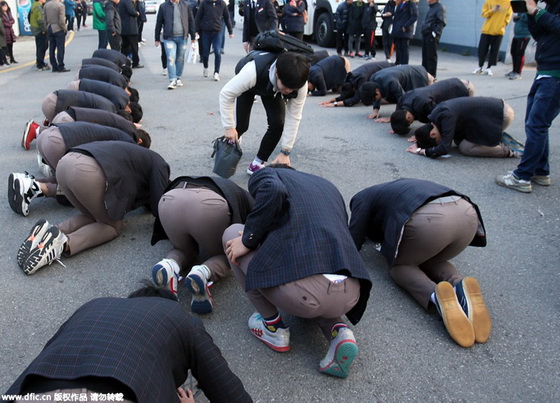 韓國高考的當天,有的低年級的學生會給參加高考的學長們跪地叩拜行大禮,以表示衷心的祝福。
