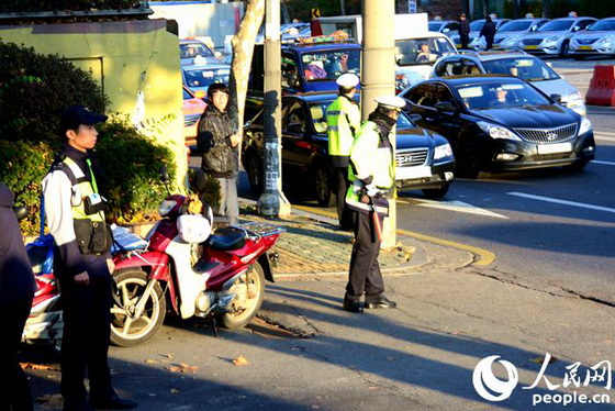 為了應對各種突發情況,考點門口的巡警、交警也已早早到位。 夏雪 攝