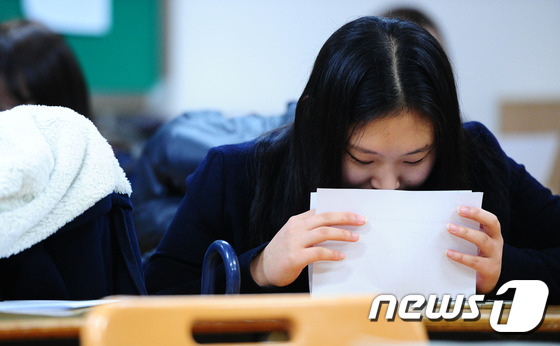 高考成績揭曉,考生們都面帶緊張的表情,小心翼翼地打開成績單進行確認。(圖片來源:news1)