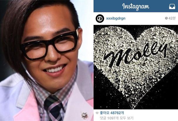 權志龍曾在個人instargram上傳過一張由白色粉末組成的心形圖案,圖案中央寫著“Molly”。