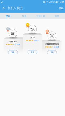 拍照功能方面也比較全面,包括專業、飲食、夜拍、夜景等,用戶也可以去商店下載更多的模塊,目前可供下載的有GIF、運動以及后置相機自拍,不過旁邊的“付費下載”估計能夠吸引開發者為Galaxy C5開發有趣好玩的拍照應用。